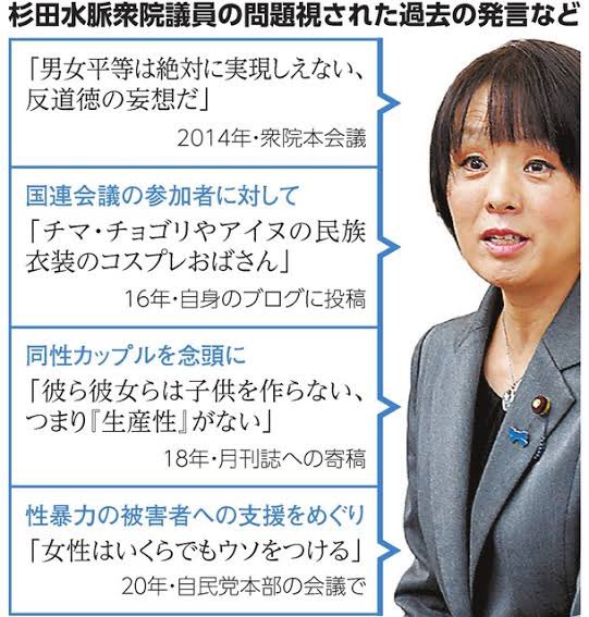 杉田 水脈(すぎた みお、1967年4月22日 - )は、日本の政治家。自由民主党所属の衆議院議員(2期目)。新しい歴史教科書をつくる会理事。鳥取大学農学部卒。旧姓は吉岡。