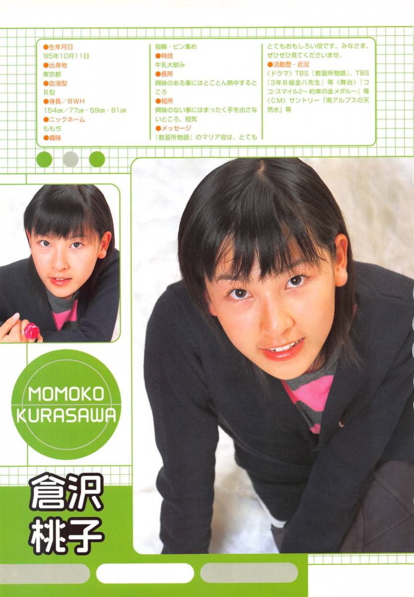 倉沢 桃子(くらさわ ももこ、1985年10月11日 - )は女優、歌手。東京都出身。倉沢桃子project team[KPT]management。かつては株式会社Congafamiliar、ムーン・ザ・チャイルド及び武田鉄矢商店に所属していた。