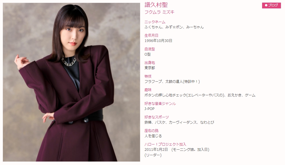 譜久村 聖(ふくむら みずき、1996年10月30日 - )は、日本のアイドルであり、女性アイドルグループ・女性ヴォーカル&ダンスグループのモーニング娘。の第9期メンバー・第9代目リーダーである。公式ニックネームはふくちゃん、その他の愛称はみず☆ポン、みーちゃん。
